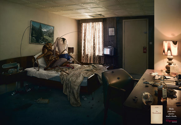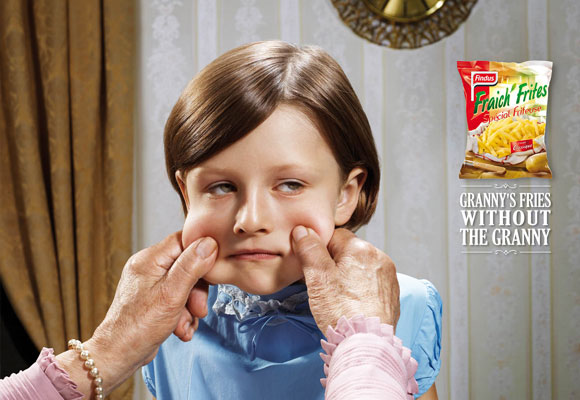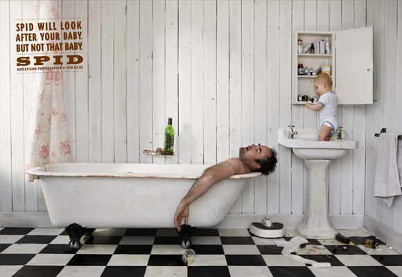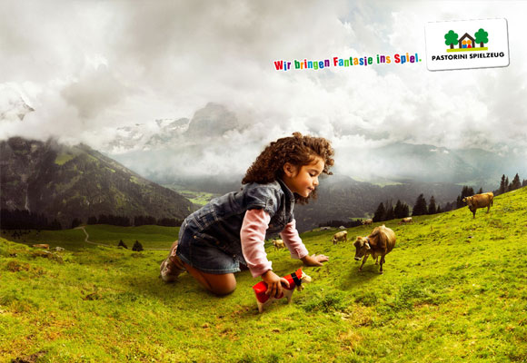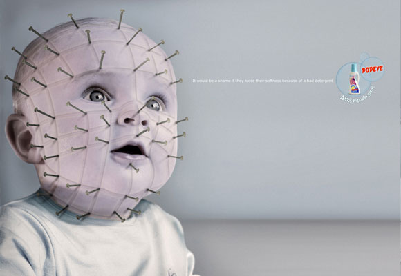 No anúncio o designer fez com que a criança fosse uma estatueta, como se fosse uma peça de museu, muito bom!