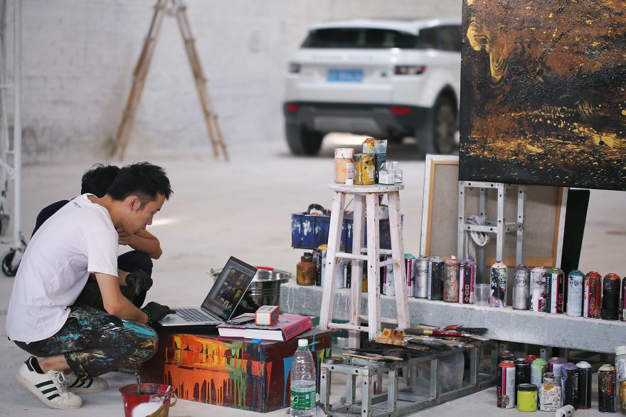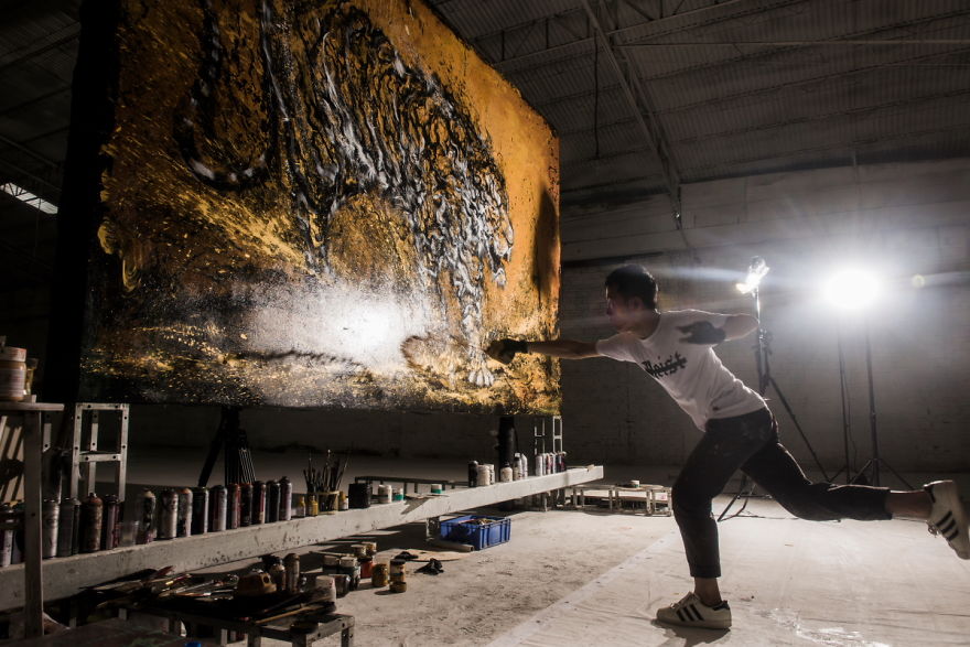Em suas artes, Hua começa praticamente “jogando” a tinta sobre a parece ou superfície que deseja pintar e aos poucos, com a ajuda de pincéis e muitas coreografia na hora de arremessar a tinta escolhida, faz com que o desenhos vá surgindo.