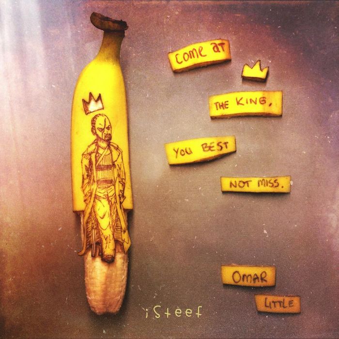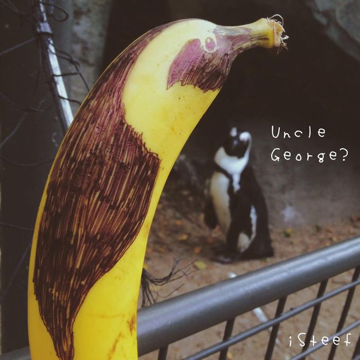 Em sua nova série, Stephan fez da banana diversos personagens e até mesmo pinturas famosas. O mais criativo é que esse artista usa a casca da banana para dar a forma desejada e a banana acaba virando somente o fundo da imagem.