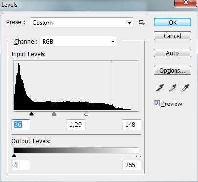 2. Use a ferramenta Levels (CTRL + L) e coloque os resultados como na foto abaixo;