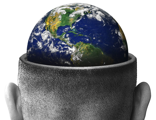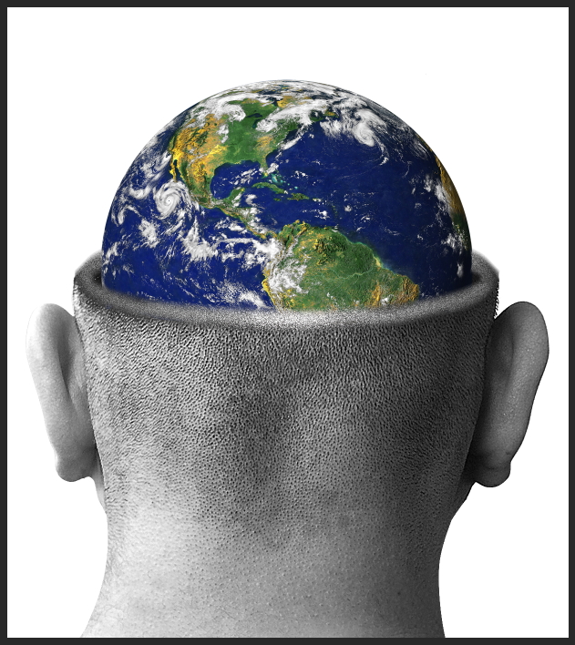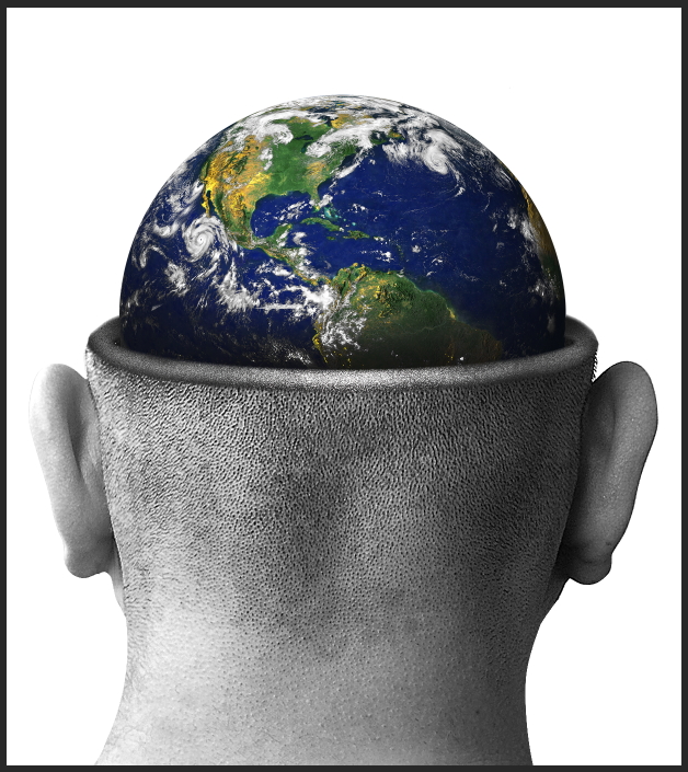 Vendo esta matéria eu me inspirei em criar uma montagem surrealista em que o planeta terra ficasse dentro de nossa cabeça e passar a impressão que com a internet o mundo ficaria pequeno em nossas cabeça, então fui correndo para o Photoshop para criar, tive um resultado bem satisfatório, veja abaixo.