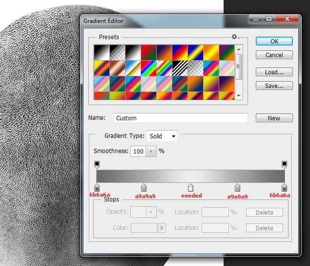 Agora crie uma nova layer sem retirar a seleção aplique um efeito de gradiente nela de acordo com as cores abaixo.