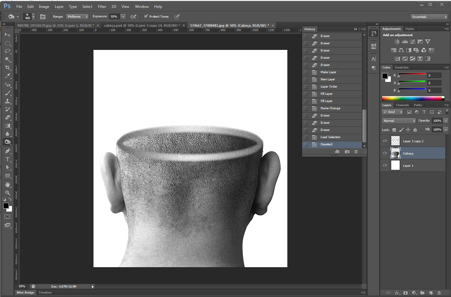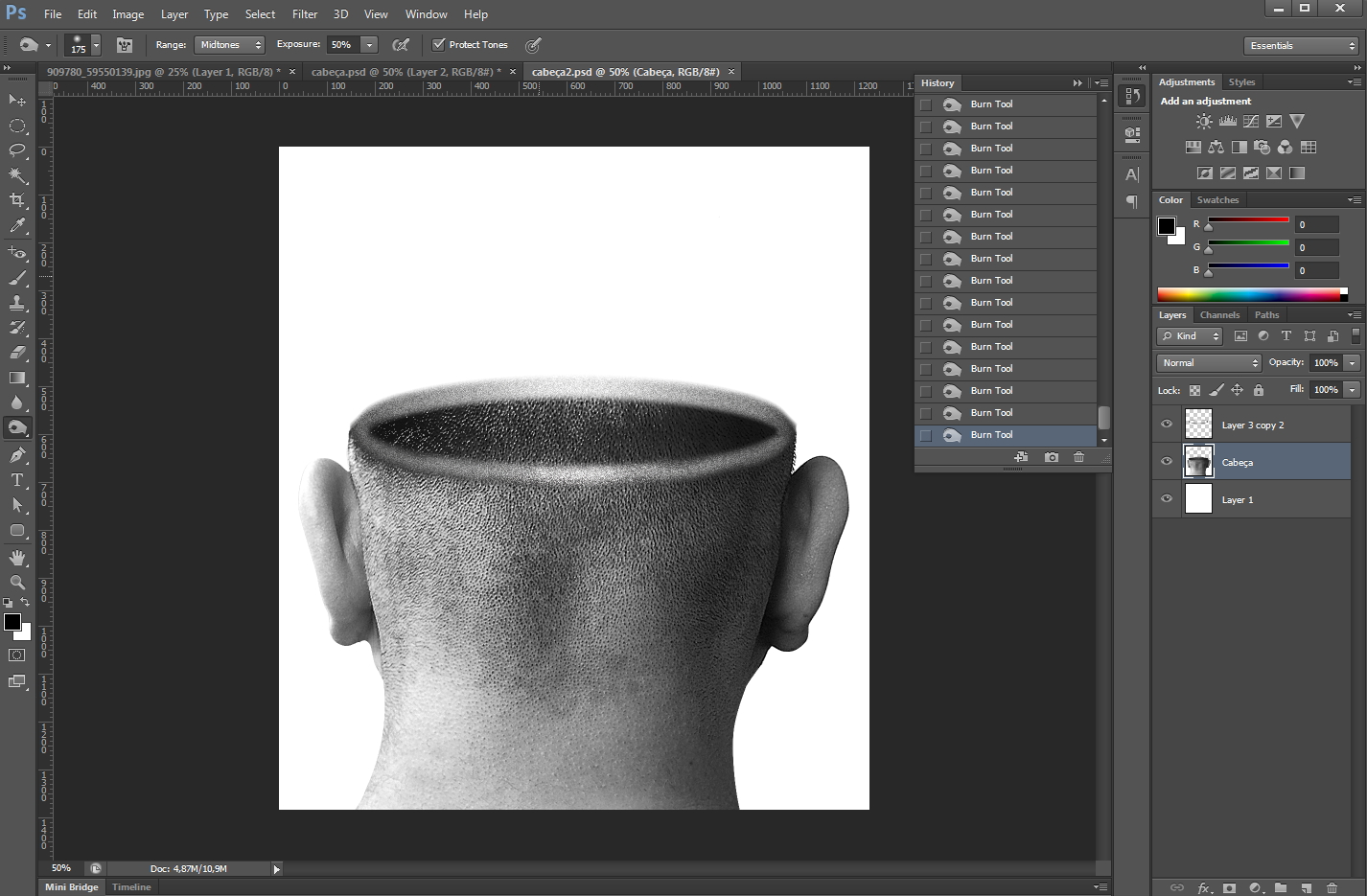 Use agora a ferramenta BURN TOOL (O) para colocar mais realismo na área do corte e da parte interna cabeça. Use esta ferramenta com cuidado que dependendo do que for feito vocês pode fazer um estrago se querer, vá pincelando nas bordas do corte e nas laterais da parte interna da cabeça;