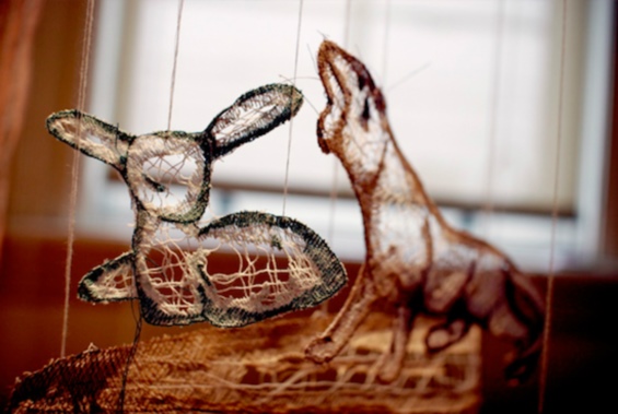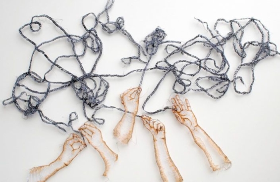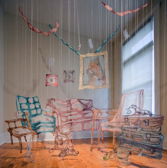 A artista Amanda McCavour usa fios e tecidos solúveis para criar efeitos em ambientes como se fossem teias de aranha.