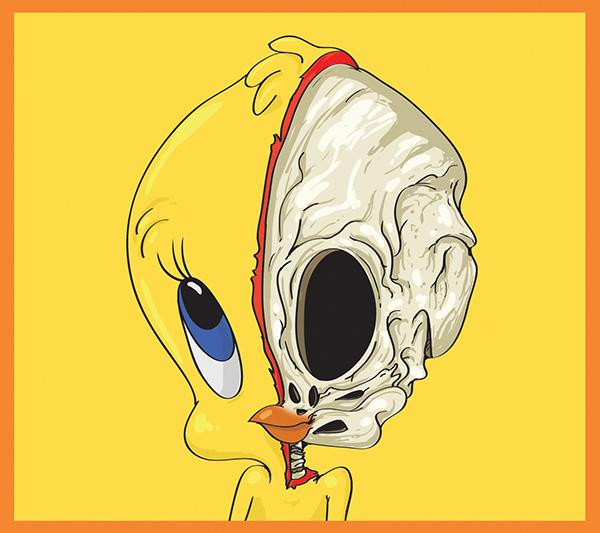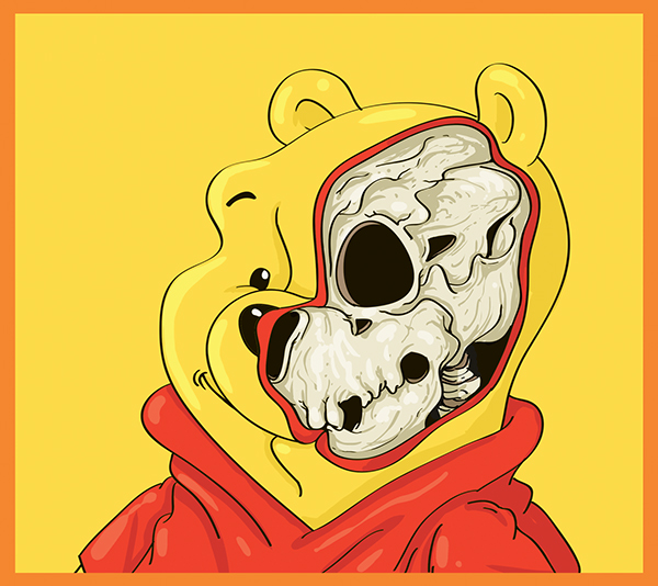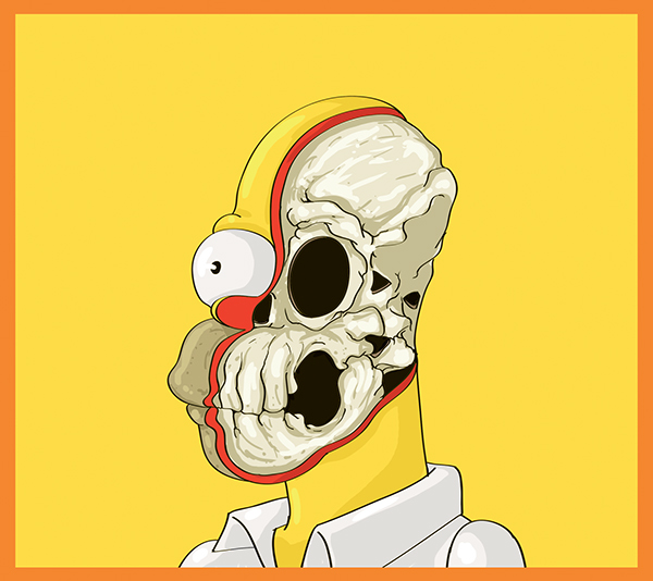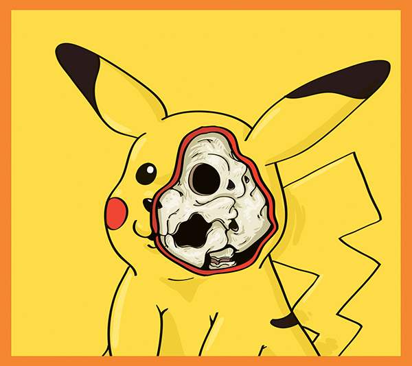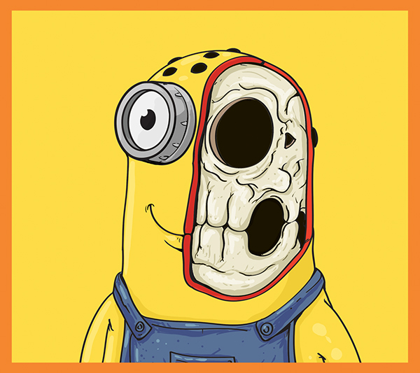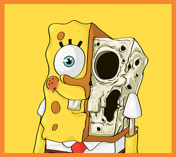 Então selecionou cada um dos personagens, incluindo Bob Esponja, Pikachu, os Minnions entre outros e resolveu deixar aparente parte de seus rostos, ressaltando os ossos.