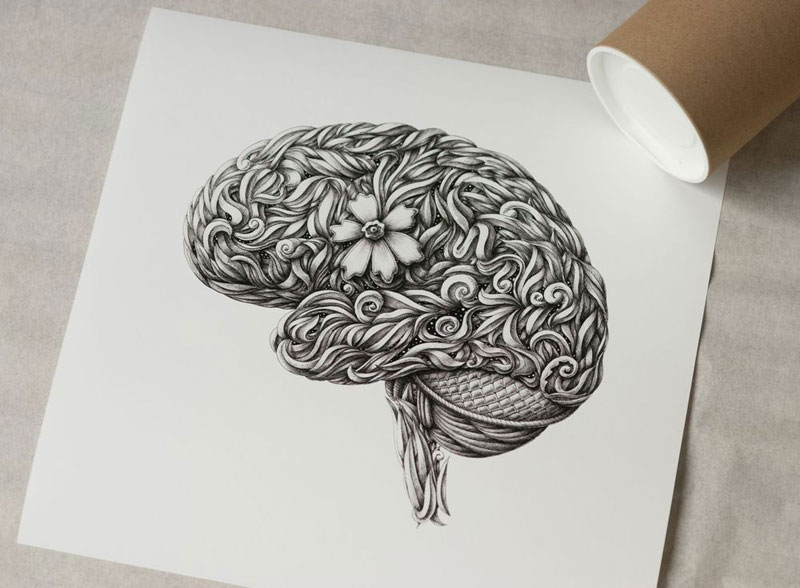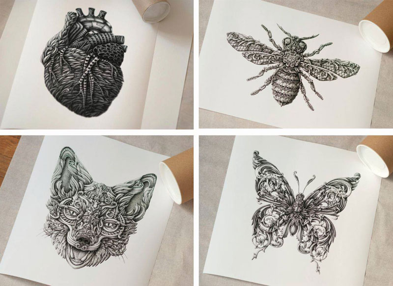 Todos em preto e branco e feitos em folhas de sulfite A3 ou A2, seus desenhos chamam a atenção de todos, Alex ilustra tudo que pode como um cérebro, coração, órgãos femininos e borboletas, todos sempre muito criativos.