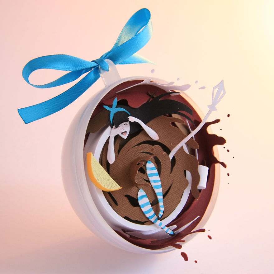 Os detalhes de papel são cortados e pintados por Adamova que delicadamente, monta cada detalhe dentro da bola de plástico, e deixa tudo lindo e super criativo.
