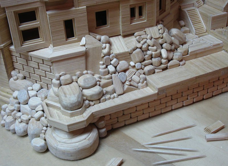 Já foram usados mais de 100 mil palitos e são esculturas uma mais linda que a outra, Bob possui uma criatividade imensa e um talento maior ainda, pois a quantidade de detalhes em cada escultura não nos deixa na duvida.