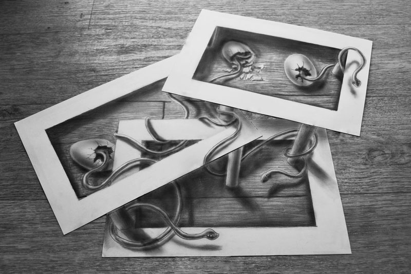 Ramon cria seus desenhos e consegue através da captura com uma câmera no ângulo perfeito dar a ilusão de efeito 3D.