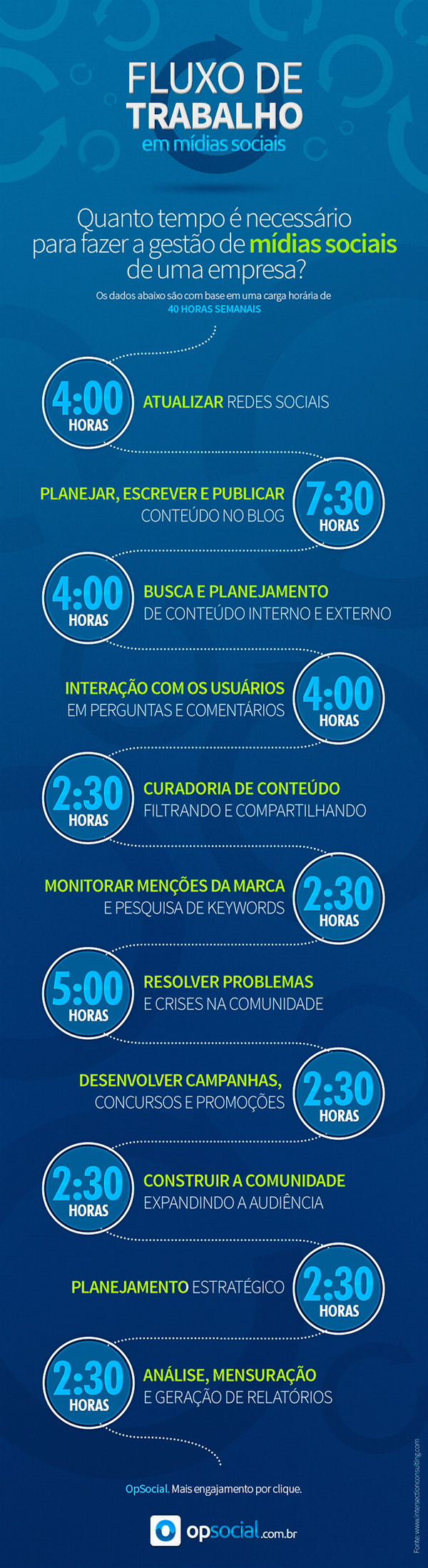 A agência Opsocial criou um infográfico com base em 40 horas semanais de trabalho na gestão de mídias sociais de apenas uma empresa, veja que o que parece brincadeira é na verdade um trabalho desafiador.