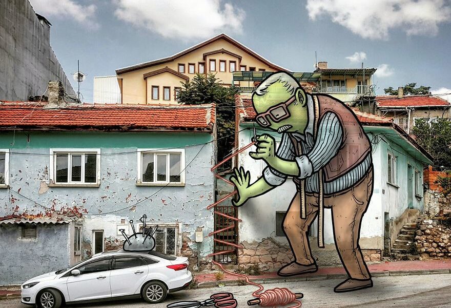 Após fotografar locais com seu Smartphone, ele adiciona as suas ilustrações criativas de gigantes, e que interagem com as imagens capturadas por Hakan.