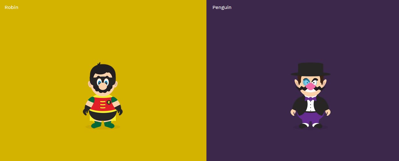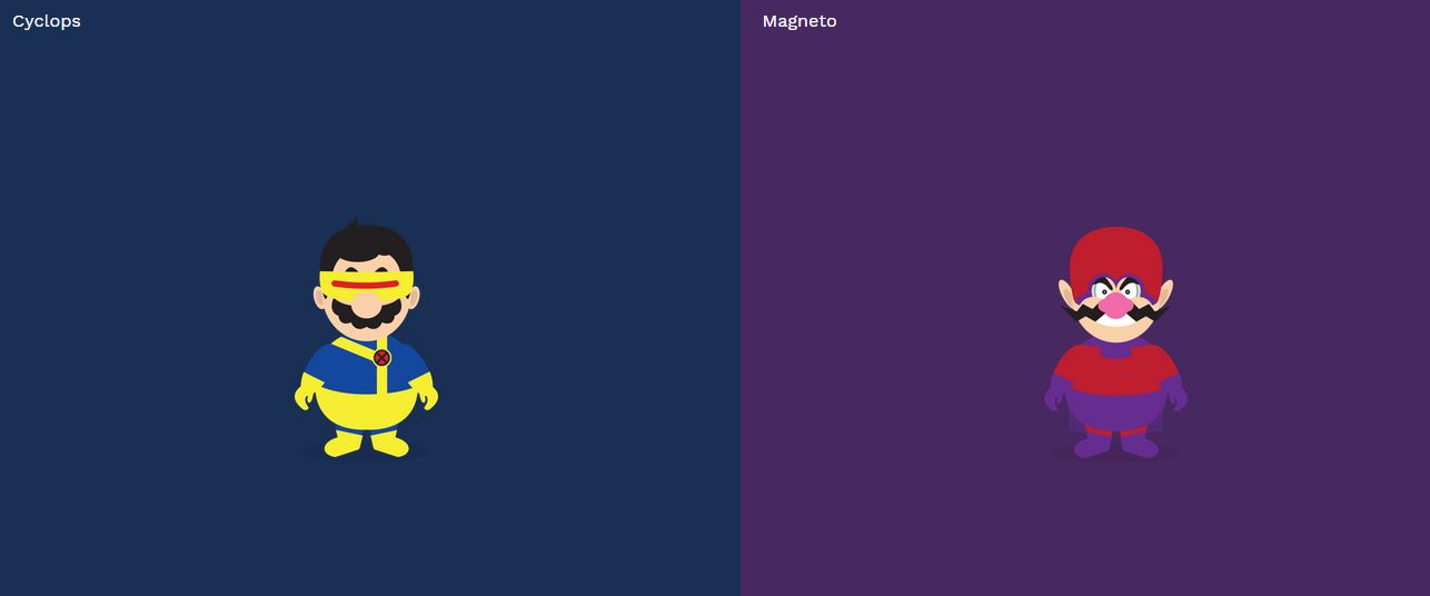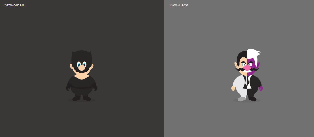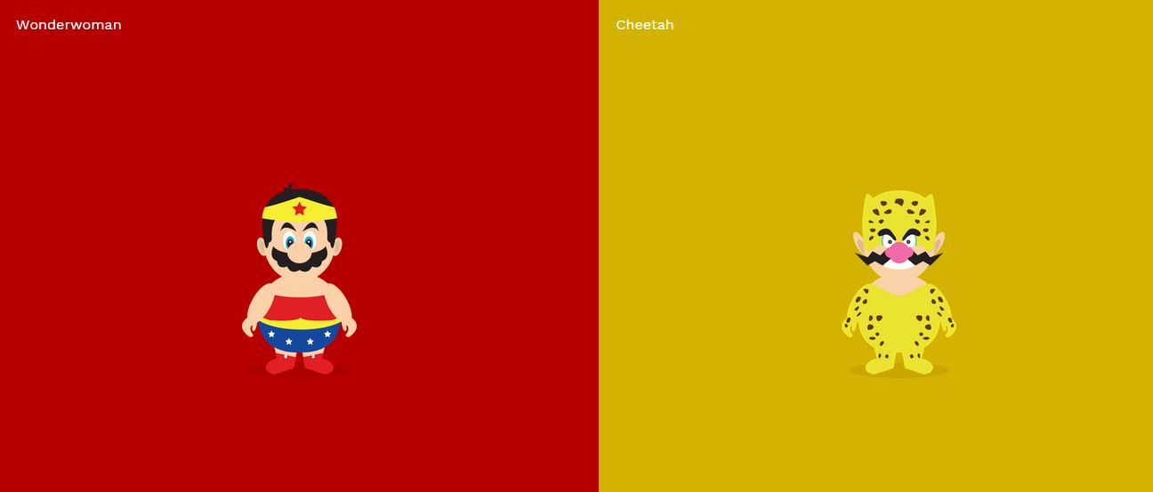 Para comemorar o aniversário de 30 anos do Mario, o ilustrador e desenhista Rob Lafratta criou uma série de “Mários” como diversos personagens conhecidos, como Batman, Robin, Mulher maravilha, Mulher gato, Super Homem, Homem Aranha, Hulk, entre outros.