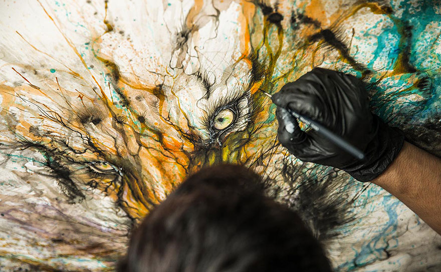 Em sua última série, que compartilhamos aqui, Hua havia compartilhados desenhos feitos em pintura, com muitas cores e com um aspecto parecido com borrões de tinta, perfeitos borrões para dizer a verdade.