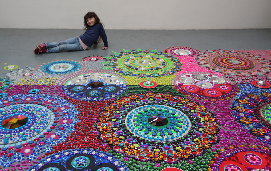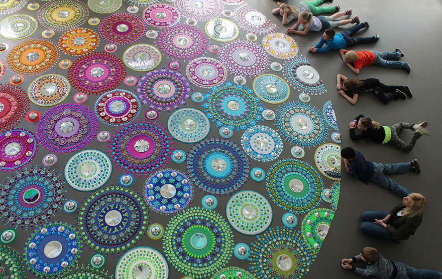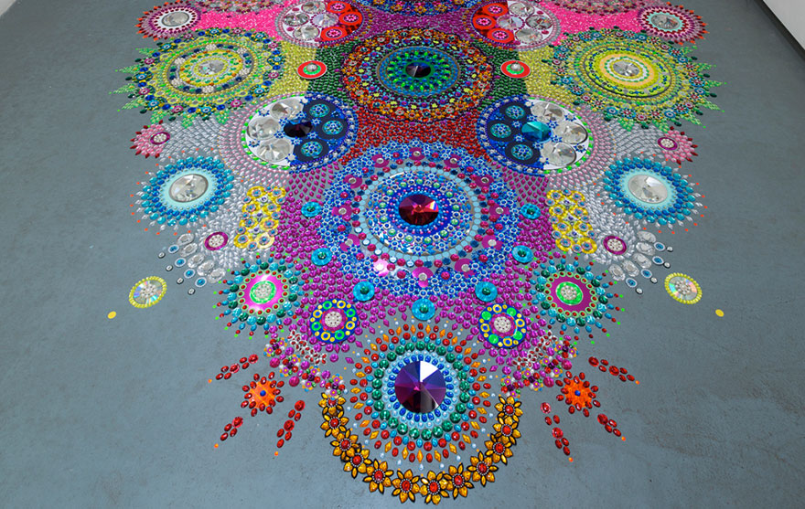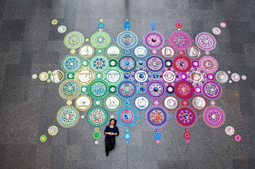 Cada peça se transforma em uma linda mandala, uma mandala gigante. Suzan diz que nenhuma de suas peças vem pré desenhadas, todas ela cria na hora. Após chegar ao local que irá formar a peça, ela sente o lugar, sente o espaço, analisa o tamanho, a altura, as cores, por onde os visitantes vão entrar, e só então começa a criação.