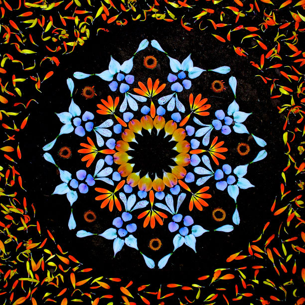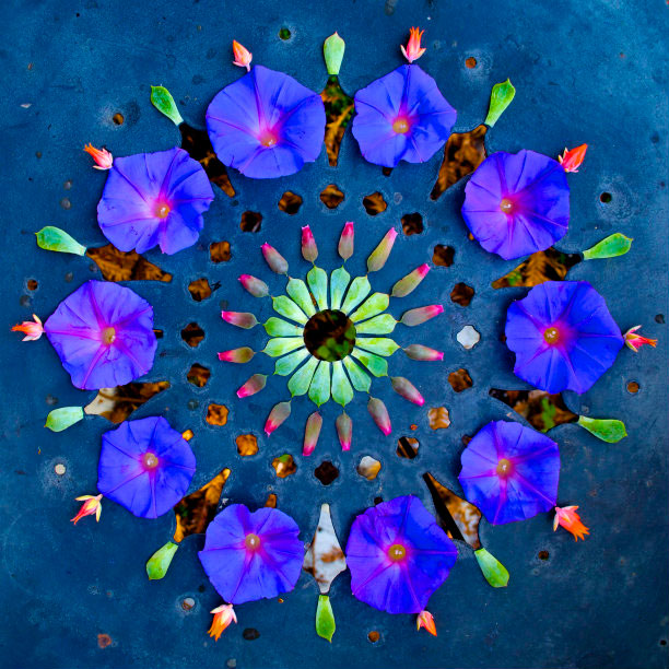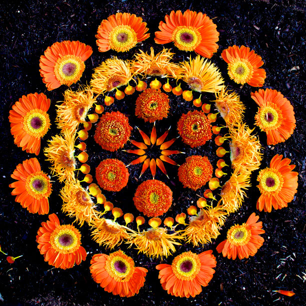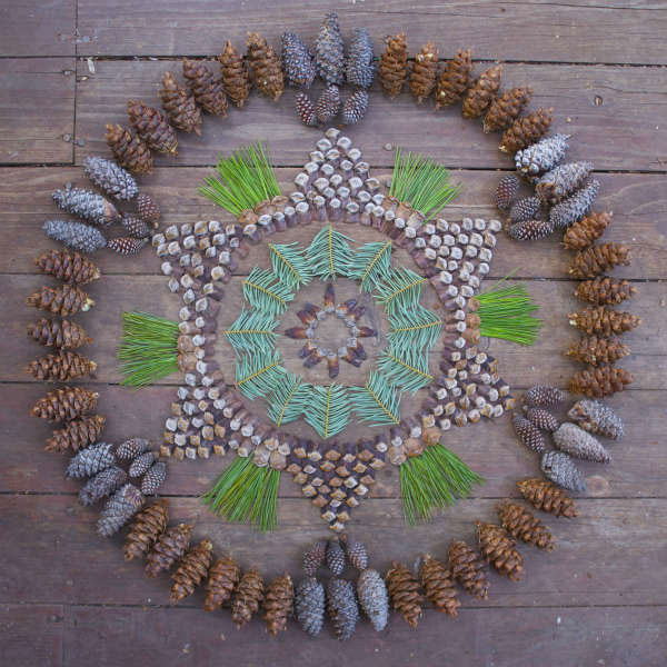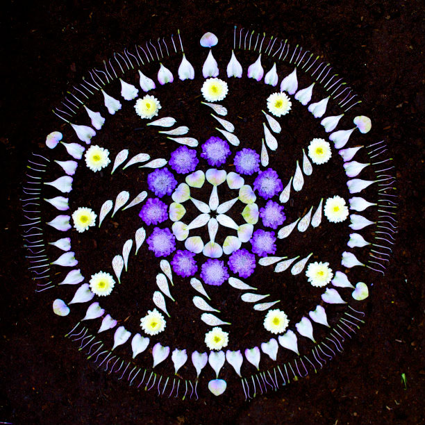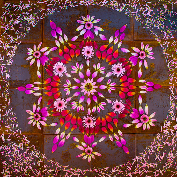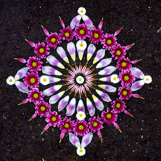 É exatamente o que Kathy Klein faz, e por sinal faz muito bem. Todas as suas mandalas são seitas com plantas e flores, que ela vai montando e colocando em locais específicos para a formação de cada uma.