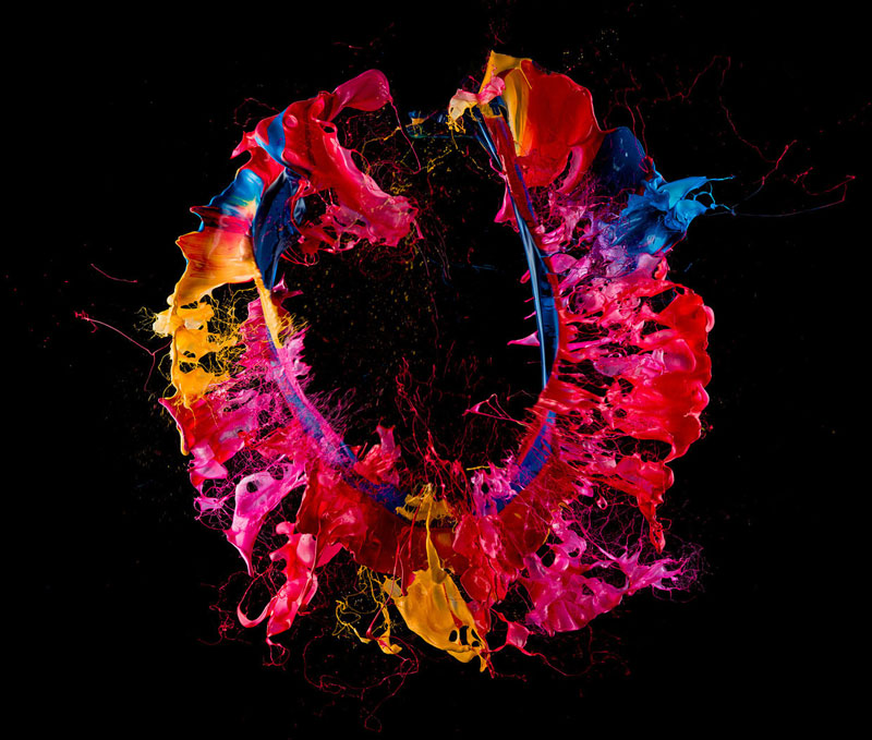 A forma com que fez a manipulação dessa vez foi a seguinte, ele fotografa o exato momento em que estoura um Balão coberto com tintas de várias cores, o efeito surge do momento em que com o estouro, o ar do balão sai e lança as tintas para várias direções e é nessa hora que você consegue ver as cores se misturando e formando outras, sem contar o efeito que é sensacional, não acham?!