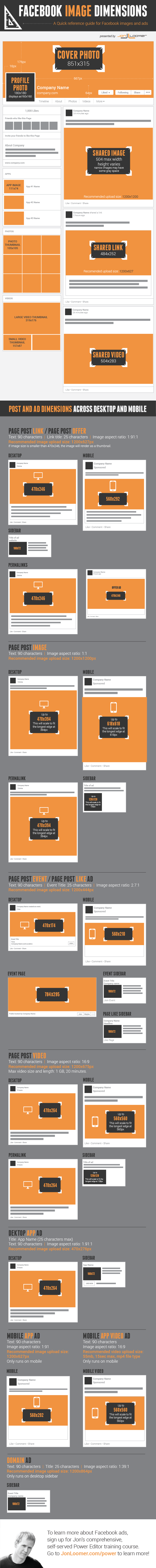 Então, para resolver isso e também te dar uma ajudinha extra nestas horas o marketeiro de Facebook Jon Loomer criou um manual de referência rápida para o Facebook, neste manual consta a dimensão de todas as imagens do Facebook, com este manual tenho certeza que você não errará mais no tamanho de suas imagens.