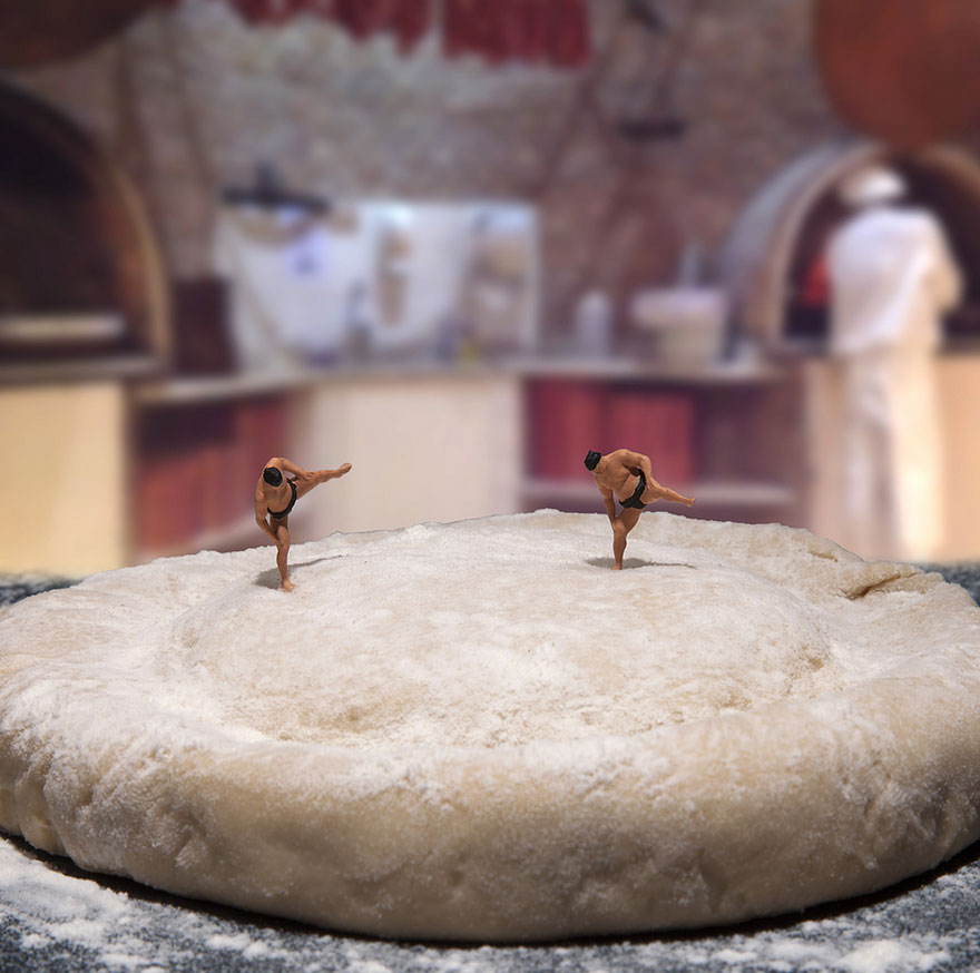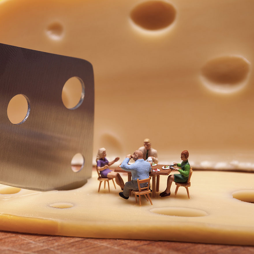 Suas artes usam as comidas como cenário de um mundo imaginário onde pessoas minúsculas vivem e fazem parte dele.