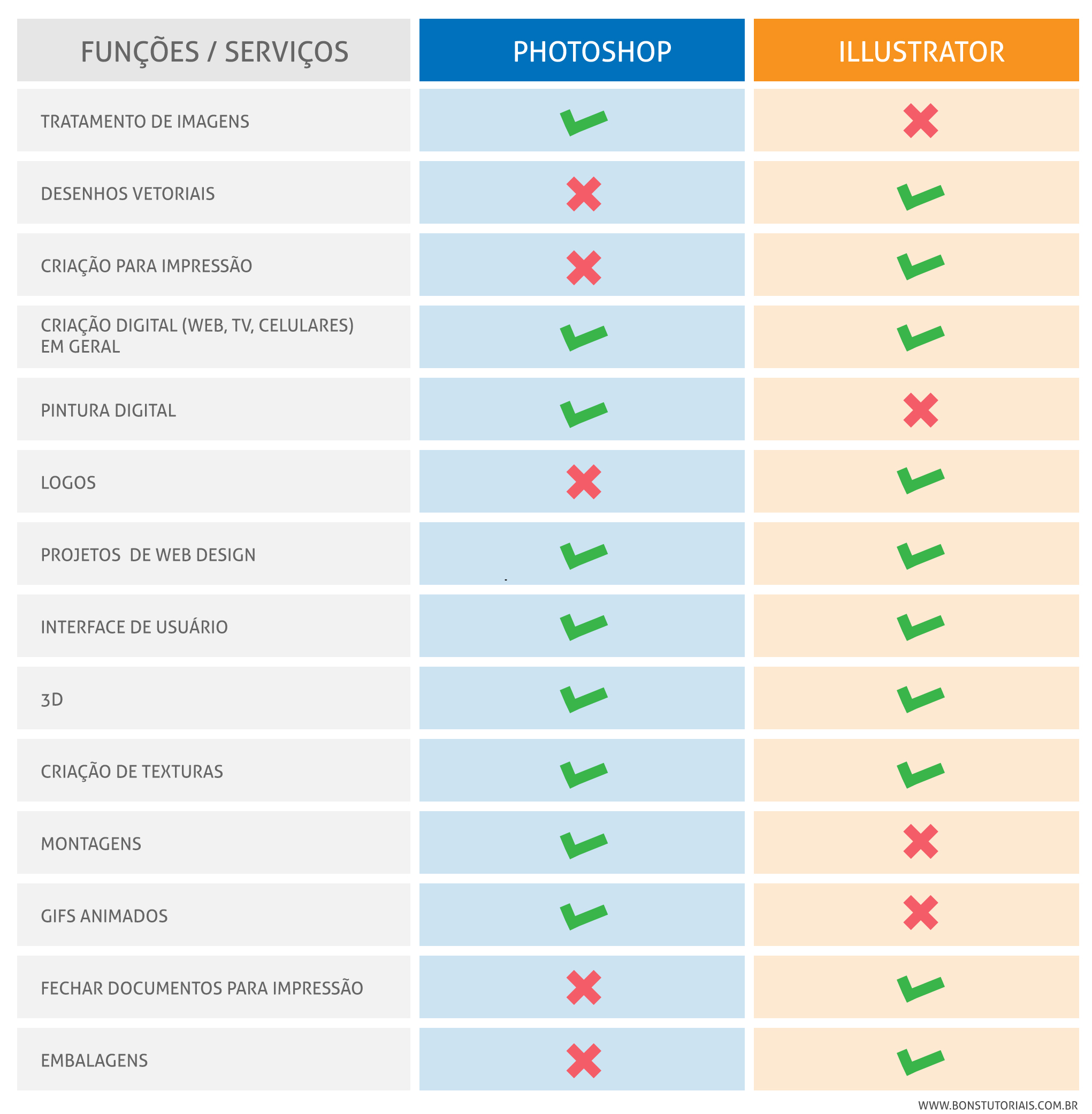 Como você pode ver, de uma para o outro as diferenças são poucas, podemos sim fazer tudo só com um deles, mas para facilitar sua vida e ganhar tempo é melhor fazer com a ferramenta apropriada.