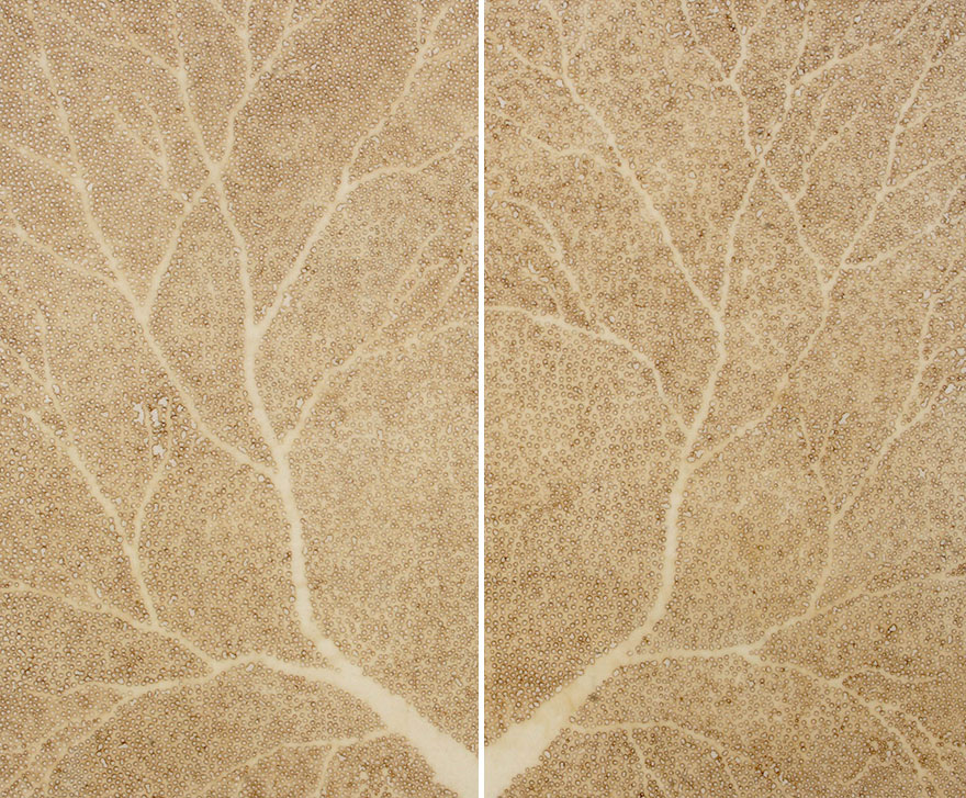 É impressionante o que ele pode fazer com pequenos pontos nas folhas e consegue chegar a grande desenhos de árvores, plantas e outros objetos mais que decidir fazer.
