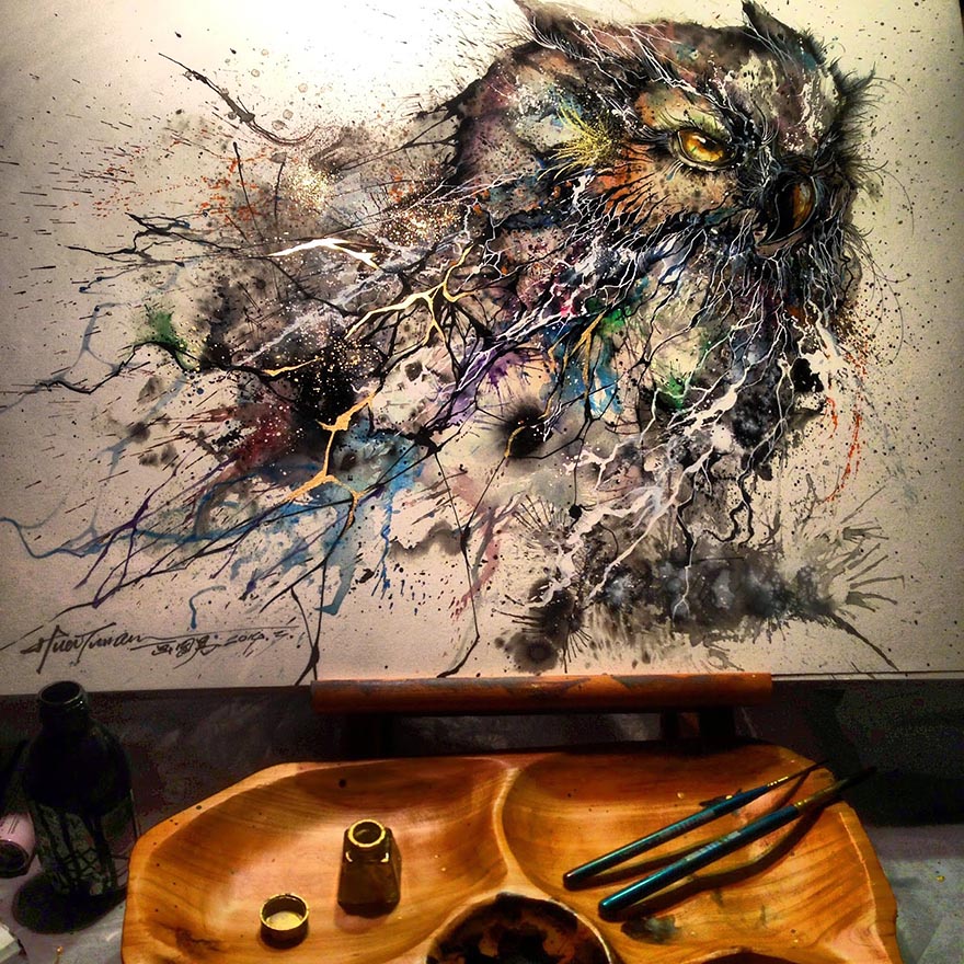 Em seu ultimo trabalho Hua Tunan criou lindas corujas, com efeito, onde cada uma surge entre fumaças de respingos e gotas das mesmas cores de tinta da qual a coruja é formada!