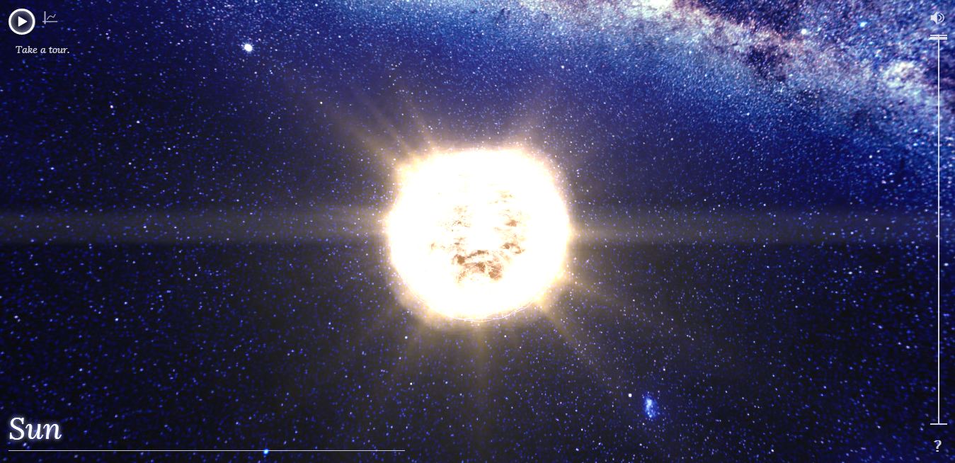 No site para você não se perder tem um botão “Take a tour” lá o experimento te apresenta todo o espaço para você entender melhor. Veja como o nosso universo é tão imenso que nós somos apenas poeira nas estrelas.