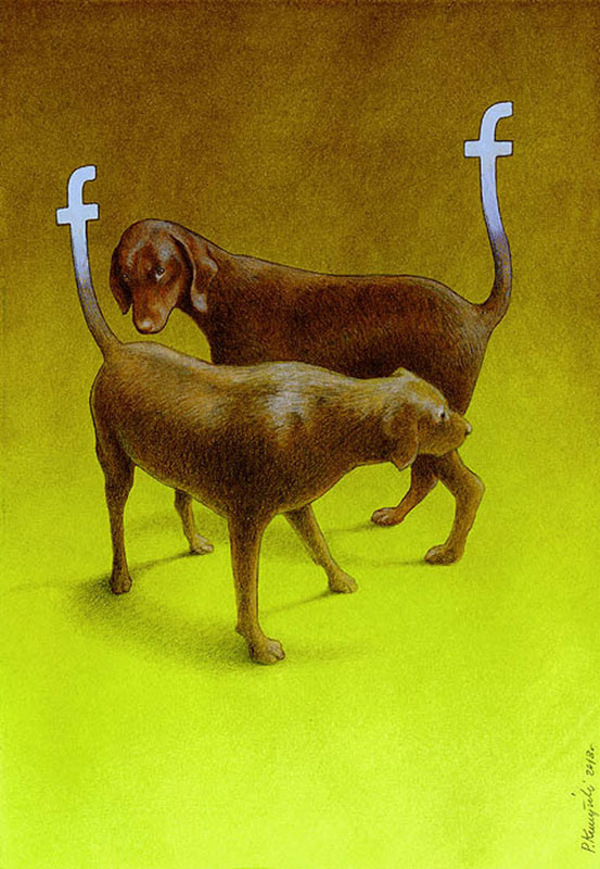 Nas ilustrações Pawel mostra na maioria das vezes com sátiras, como as pessoas se envolvem e como lidam com suas vidas na rede social.